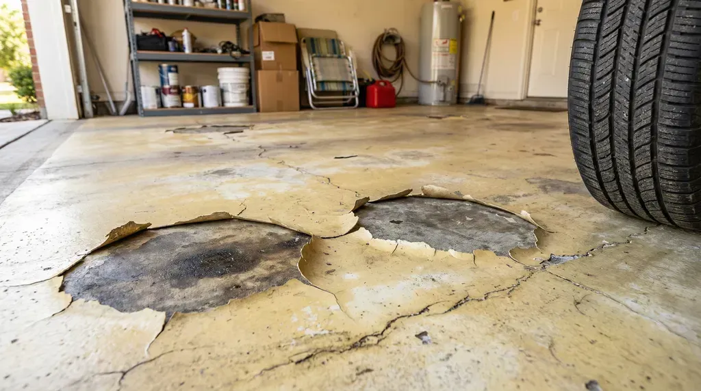 Car tires absorb heat from asphalt while driving and carry it onto your garage floor. When that heat transfers through the tires, it can soften the epoxy enough to pull it away from the concrete. The result is visible marks and peeling that can't be spot-fixed, only fully recoated.